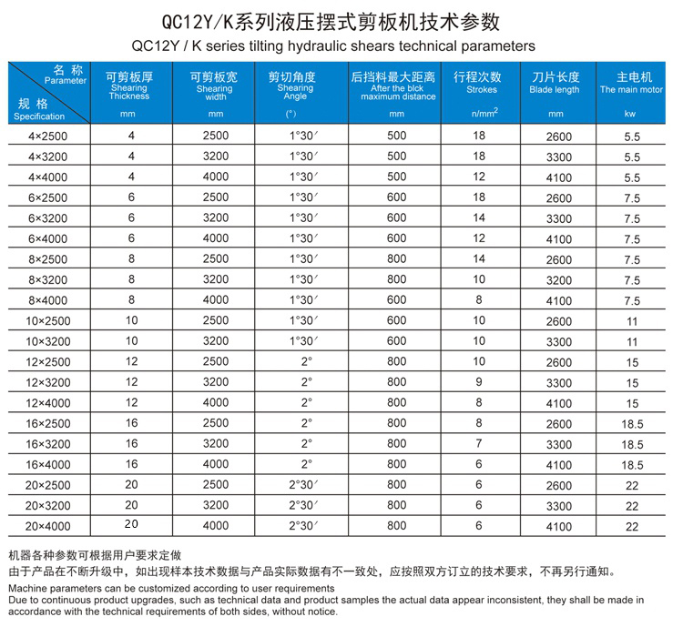 QC12K数控液压剪板机高强度铸铁机身,固定台式结构,增加了稳定性。采用穿轴式结构和铸钢离合器,轴内为新型耐磨轴套,大型机床均采用铸钢齿轮。大幅延长使用寿命。电器采用国内及国外名牌产品,配备双手启动装置,油泵集中润滑,可选装光电保护和自动集中供油,能配合多种数控送料系统合并使用。